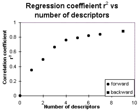 A new group electronegativity scale has been proposed in the reference [8], and its comparison with other scales of group electronegativity has been discussed. The application of group electronegativity, inorganic property and organic property values of drug molecules have been successfully used in QSAR studies of some drug molecules [13,14,15,16,17]. To further test the usefulness of group electronegativity, inorganic property and organic property values, the common data set used in recent published papers was selected and tested (the detail data set and descriptions can be seen in literature [18,19]). Maddalena and Johnston [18] used ten final descriptors out of 6×7 = 42 descriptors (π7, Mr1, Mr2, Mr6, F7, F2, R1, σm3, σn8, μ1), found that using artificial neural network methods which gave a high value of correlation coefficients for both training (0.938) and cross-validation (0.896) to perform similar study. Sung-Sau So and Martin Karplus [19] used six descriptors ( π7, F7, Mr1, σm2, π6, Mr8), which gave QSAR results as good or even better than those calculated using higher dimensions by genetic QSAR neural networks [20]. The author does not focus on the methods for QSARs, but focuses on the parameters proposed here. The electronegativity for each of six groups was calculated, as well as the sum of the inorganic property and organic property values, and the sum of the lipophilicity (π) value. The thirteen parameters used in the references [18,19] were also used here. Therefore, in total, twenty-two descriptors were used here for fifty-seven benzodiazepines QSAR studies, using the Minitab program (a common statistical program). By using forward selection method and selecting up to seven descriptors, no proposed parameters were selected, but most of them are among the best ten alternative descriptors, which means that they can be substituted for other descriptors if they are not available. By using a backward elimination method, the proposed parameters are useful in nine-descriptor-QSAR equation (see below). Table 5 gives the summary, and Figure 3 shows the plot of the correlation (r2) versus number of descriptors used in the equation.