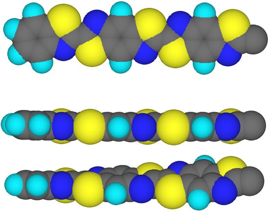 Image of fragment A-B-B- of the benzothiazole (A)-benzobisthiazole (B) linear oligomer A-B13-A: a) front view of the 000 rotational isomer; b) top view of the 000 rotational isomer; c) top view of the +++ rotational isomer. For clarity, the rotation angles have been slightly enhanced (to 20°) in this figure to make the torsional effects clearer.