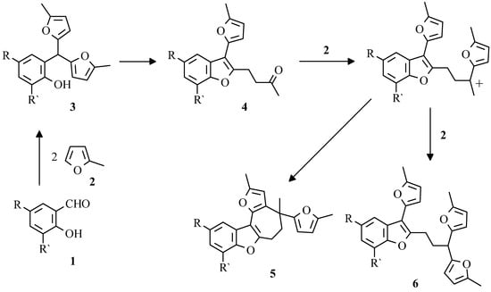 Thus, starting from the compounds 1 and 2, it is possible to obtain 2-hydroxyaryldifurylmethanes 3, benzofurans 4 or oxazulene derivatives 7, 9 with high selectivity by simple change of the catalyst and solvent.