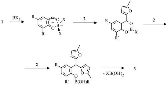In the course of our work we have found that phenylboric as well as boric acid and boric anhydride are effective in selective transformation 1 into aryldifurylmethanes 3 [31]. The reaction is very selective, since only salicylaldehydes are involved due to intermediate formation of a chelate complex of aldehyde with boric acid (Scheme 2).