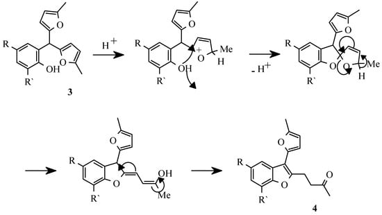 The selective transformation of compounds 3 into benzofuran derivatives 4 occurs in ethanole saturated with HCl giving minimum tarification and high yields of the reaction products (Scheme 5) [34].