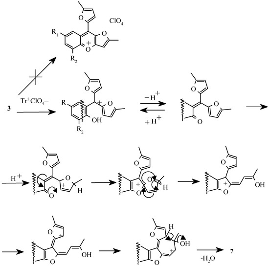 It is of interest that this reaction pathway is in contrast to that reported for 2-hydroxytriphenylmethanole which gave 9-phenylxanthilium perchlorate under the treatment with tritylperchlorate [36]. In the case of 2-hydroxyaryldifurylmethane 3 apparently the transformation of preliminary formed 2-hydroxyarylbis(5-methylfur-2-yl)carbenium ions has happened (Scheme 9).