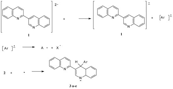 The same results were obtained in the arylation reaction. Thus, dianion 1 obtained from 1.25 mmol 2,3’-biquinolyl and 2.7 mmol potassium does not react with bromobenzene in the presence of 3 mmol 18-crown-6 even after two hours reflux. On addition of 1.5 mmol KI the reaction proceeds in the usual way and results in formation of 4 a.