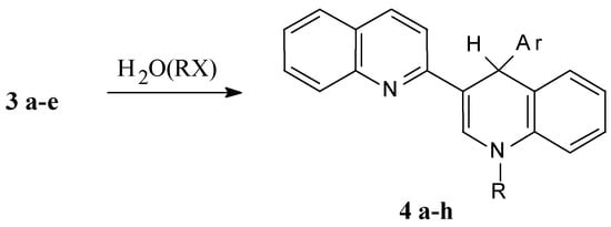 Indeed, the continuous addition of aryl or hetaryl halides to the dianion 1 obtained in the reaction of 2,3’-biquinolyl with metallic lithium in THF [1] with the subsequent treatment of the resulting mixture with water yielded 4’-aryl(hetaryl)-1’,4’-dihydro-2,3’-biquinolyls (4 a-e) with yields ranging from 64 to 78%. The treatment of the reaction mixture with alkyl halides instead of water results in formation of Nalkylation products, i.e. 1’-alkyl-4’-aryl(hetaryl)-1’,4’-dihydro-2,3’-biquinolyls (4 f-h) with yields in the range 72-75% (Scheme 2).