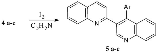 Compounds 4 a-e are readily oxidized by iodine in pyridine to 4’-aryl-2,3’-biquinolyls (5 a-e) with nearly quantitative yield (Scheme 3).