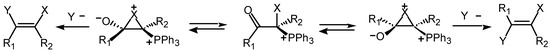 The formation of the observed products was explained by postulating isomeric halonium ions as intermediates. These halonium ions could interconvert by way of an acyclic cation (Scheme 2). The opening of the two halonium ions by a nucleophile would lead to the isomeric alkenes after the elimination of triphenylphosphine oxide.
