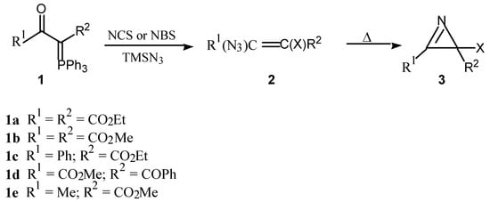 α-Oxophosphonium ylides (1a–1e) also react with N-chlorosuccinimide and N-bromosuccinimide in the presence of azidotrimethylsilane giving the corresponding haloazidoalkenes (2) with elimination of triphenylphosphine oxide [1,2]. These compounds were completely converted into the corresponding 2H-azirines 3 on heating in heptane (Scheme 3) [2].