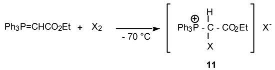 - Denney, D.D.; Ross, S.T. The Preparation and Reactions of some Halophosphoranes. J. Org. Chem. 1962, 27, 998–1000. [Google Scholar] Märkl, G. Synthese von α-halogenierten, α,β-Ungesättigten carbonsäuren mit Triphenylphosphin-halogen-carbomethoxy-methylene. Chem. Ber. 1961, 94, 2996–3004. [Google Scholar] Speziale, A.J.; Tung, C. C. Debromination of N,N-Diethylcinnamamide dibtomide. J. Org. Chem. 1963, 28, 1353–1357. [Google Scholar] Märkl, G. Triphenylphosphin-halogen-acyl-methylene. Chem. Ber. 1962, 95, 3003–3005. [Google Scholar] Zbiral, E.; Rasberger, M. Reaktionen mit Phosphoganischen Verbindungen-XXI. Tetrahedron 1969, 25, 1871–1874. [Google Scholar] Zbiral, E.; Rasberger, M.; Hengstberger, H. Synthese and Eigenschaften von α-Acylvinylphosphoniumsalzen. Liebigs Ann. Chem. 1969, 72, 22–28. [Google Scholar] Martin, D.; Niclas, H.-J. Reaktionen von Bromcyan and cyansäure-arylesters mit carbanionenaktiven Phosphorverbindungen. Chem. Ber. 1967, 100, 187–195. [Google Scholar] Akiba, K.; Eguchi, C.; Inamoto, N. Formation of α-hydroxyiminophosphonium chlorides by Reaction of Phosphine-alkylenes with nitrosyl chloride and their Decompositions. Bull. Chem. Soc. Jpn. 1967, 40, 2983. [Google Scholar]
