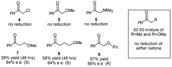 - Ohkuma, T.; Ooka, H.; Yamakawa, M.; Ikariya, T.; Noyori, R. Stereoselective hydrogenation of simple ketones catalyzed by Ruthenium(II) complexes. J. Org. Chem. 1996, 61, 4872–4873. [Google Scholar] [CrossRef]