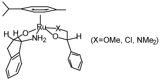- Takehara, J.; Hashiguchi, S.; Fujii, A.; Inoue, S.; Ikariya, T.; Noyori, R. Amino alcohol effects on the ruthenium(II)-catalysed asymmetric transfer hydrogenation of ketones ion propan-2-ol. J. Chem. Soc., Chem. Commun. 1996, 233–234. [Google Scholar] [CrossRef]