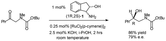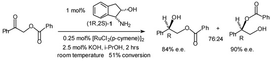 - a) Hashiguchi, S.; Fujii, A.; Takehara, J.; Ikariya, T.; Noyori, R. Asymmetric transfer hydrogenation of aromatic ketones catalysed by chiral ruthenium(II) complexes. J. Am. Chem. Soc. 1995, 117, 7562–7563. [Google Scholar] [CrossRef] b) Matsumura, K.; Hashiguchi, S.; Ikariya, T.; Noyori, R. Asymmetric transfer hydrogenation of α,β-acetylenic ketones. J. Am. Chem. Soc. 1997, 119, 8738–8739. [Google Scholar] [CrossRef]