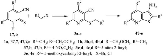 The reactions of pyridinethiones 1a,b with 4-nitrobenzyl bromide and methyl 5-chloromethyl-2-furoate were run in dimethylformamide (DMF) in the presence of KOH, and for 5-nitro-2-furylmethyl bromide, in ethanol in the presence of K2CO3. The ratio of compounds 1a,b to alkylating agent to base was 1:1:1. Alkylation was assumed to be regioselective relative to the more nucleophilic centre − the sulphur atom − to give 2-thiopyridines 3 (yields 81-92%) (Table 1). Their structures were confirmed by IR, UV and NMR data (Table 2, Table 3). The presence in the structure of compounds 3 of furan and benzene rings containing an electron-withdrawing substituent enhances the acidity of the CH2 group, thus making Thorpe-Ziegler isomerization of these compounds possible to afford thieno[2,3-b]pyridines 4a-e, possibly under the action of the base (KOH was used for the syntheses of 4a,b,e and K2CO3 for that of 4c,d). The acid 4f was obtained by alkaline hydrolysis of the methyl ester 4e in aqueous DMF, followed by acidification of the reaction mixture. Aminothieno[2,3- b]pyridines 4a-g are crystalline substances ranging in colour from yellow to dark red. Their IR spectra show no νC≡N absorption for the nitrile group at 2230-2205 cm-1, as is found in the spectra of the alkylation products, and they also display a broadening of the νNH bands of the NH2 group at 3480-3220 cm-1 (Table 2), which is characteristic of the 3-amino-thienopyridines [2,3,4,7].