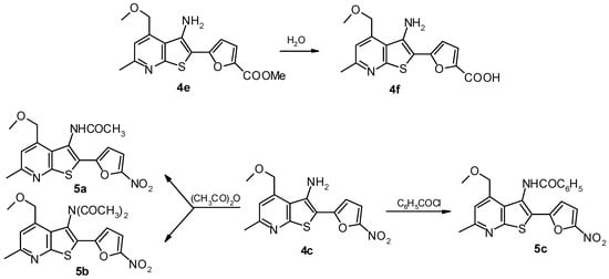 3-N-Acetylamino- and 3-N,N-diacetylamino-2-(5-nitrofuran-2-yl)-6-methyl-4-methoxymethylthieno- [2,3-b]-pyridine (5a) and (5b).