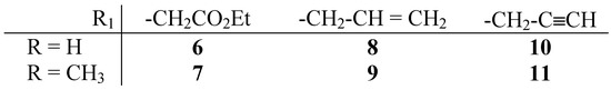 To a solution of 1.45 mmoles of compound 4 or 5 and potassium carbonate (1.45 mmoles) in dry DMF (15mL), 4.35 mmoles of the alkylating agent were added. The reaction mixture was allowed to stir at room temperature for several hours (see Table 3) and the solvent was removed under reduced pressure. The residual oil was purified by silica gel column chromatography using ethylacetate/ hexane as eluant to give compounds 6a, 6b, ..., 11b as white oils.