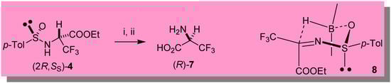 With the diastereomeric sulfinamides 4 and 5 in hand, both enantiomers of 3,3,3-trifluoroalanine (7) are easily accessible, as demonstrated in the preparation of (R)-7 from 4 (obtained by reduction of 3 with DIBAH), which was treated with 10% HCl (reflux, overnight) [d] followed by ion exchange chromatography with DOWEX-50W. We were also able to prepare (R)-7 one-pot in 38% overall yield from (2R,RS)-5 (obtained from the enantiomeric iminophosphorane (R)-2), by submitting the crude 9-BBN reduction mixture to hydrolysis with 10% HCl, followed by the usual ion-exchange purification. The stereochemistry of (R)-7 was assessed by comparison of its optical power with the literature values for non-racemic 3,3,3-trifluoroalanine [,].  Although we could not measure directly the e.e. of (R)-7, its [α]20D + 7.5 (c 0.18, MeOH) suggests a value higher than 70% [].