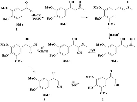 We attempted to synthesize α-hydroxyacetosyringone through a sequence of reactions including a Pummerer reaction. According to Russell and Becker [6,7], aromatic β-ketosulphoxides can be used to extend the carbon chain and also to add the desired new functional group. These β-ketosulphoxides are produced by reaction between DMSO and aldehydes or ketones in basic solutions and oxidation of the respective β-hydroxysulfoxide intermediate with MnO2 .