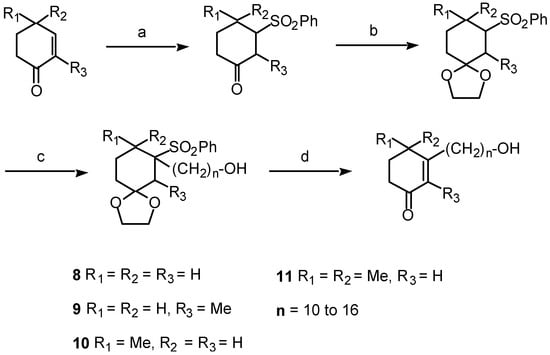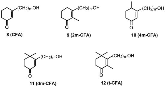 These CFAs contain basically a cyclohexenonic ring, and an ω-alkanol side chain ranging from 10 to 18 carbon atoms (Fig. 3; 8). In addition, the cyclic moiety may present one (2m- or 4m-CFA; Fig. 3; 9 and 10, respectively), two (dm-CFA; Fig. 3; 11), or three (t-CFA; Fig. 3; 12) methyl groups. The synthesis of the CFA series 8, 9, 10 and 11 was accomplished using the Umpolung strategy, which allows the inversion of the polarity in the cyclohexenone ring to introduce the hydrocarbon side chain by nucleophilic displacement (Fig. 4) [70, 71].