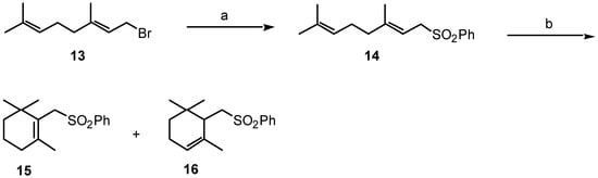 Synthesis of sulfones 15 and 16 from geranylbromide 13. Reagents: (a) PhSO2Na, MeOH, 0°C, 1 hour (80%). (b) H2SO4 32 eq., AcOH, 12°C, 30 min (90%).