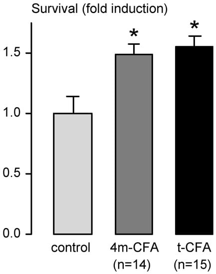 Effect of 4m-CFA (n=14), and t-CFA (n=15) on the survival of cultured CNS neurons. Substances were tested at 100 nM. The data represent means ± SE of three independent experiments. *p<0.05 vs Control; one-way ANOVA, followed by Student-Newman-Keuls test.