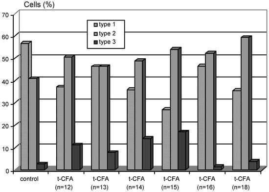 Effect of t-CFAs on neurite outgrowth. Six t-CFAs bearing an aliphatic side chain that ranged from 12 to 18 carbon atoms were tested at 100 nM. After morphometric analysis, neurons were divided into three categories according to their total neurite length (Type 1 ≤ l00 μm; Type 2 101-200 μm; Type 3 201-300 μm). Note that t-CFA (n=14) and (n=15) are the most potent molecules in stimulating neurite sprouting. The data correspond to two pooled independent experiments (50-70 cells / experiment).