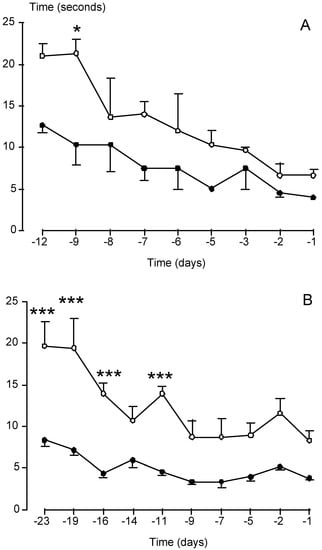 Effect of 4m-CFA (n=14) (A), and t-CFA (n=15) (B) on the ability of mice to perform an exercise. The mice used in these experiments overexpress a mutant Cu/Zn superoxide dismutase gene associated with the neurodegenerative disease amyotrophic lateral sclerosis. The task consisted in determining the time (in seconds) necessary to cross a metallic bar of 45 cm long. Substances were injected intraperitoneally at 8 mg/kg 4m-CFA (n=14) or 32 mg/kg t-CFA (n=15) three times per week during 50-60 days, and meaurements were taken at days indicated in the abscissas before disease onset and death of the animals through motor paralysis. Note that treated mice (filled circles in both graphs) are more active than control animals. *p<0.05, ***p<0.001 vs corresponding control; one-way ANOVA, followed by Student-Newman-Keuls test.