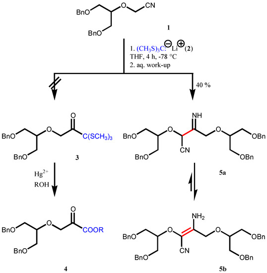 To tris(methylthio)methane [4] (0.927 g, 6.0 mmol) dissolved in anhydrous THF (2.0 mL) was added butyllithium (1.26 M solution, 5.20 mL, 6.60 mL) at -78°C under nitrogen. Nitrile 1 [1] (1.40 g, 4.5 mmol) dissolved in anhydrous THF (10.0 mL) was added dropwise to this solution after 20 min and kept at –78°C for 4 h. The reaction mixture was quenched at –60°C with satd. NH4Cl solution. Af-ter allowing to warm up to room temperature, the mixture was diluted and extracted with chloroform (25 mL). The aqueous phase was extracted with chloroform (2 × 50 mL). The combined organic phases were dried (MgSO4) and evaporated in vacuo. Chromatographic purification using 20% (v/v) ethyl acetate in hexanes afforded 3-amino-2,4-bis{2-(benzyloxy)-1-[(benzyloxy)methyl]-ethoxy}-2-butene-nitrile (5, 0.56 g, 40%) as a yellow oil.
