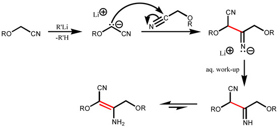 The literature search for precedents (Beilstein’s CrossFire 4.0, release BS9902PRPR using Beilstein Commander 4.0) showed that α-alkoxynitriles react normally with Grignard reagents [10] while orga-nolithium [11] and organosodium compounds [12,13] provoke self-condensation. This can be ex-plained by the strong basicity of organolithiums and the result is, just as in the above instance, the spe-cial case of the well-known Thorpe reaction [14] (Scheme 2).