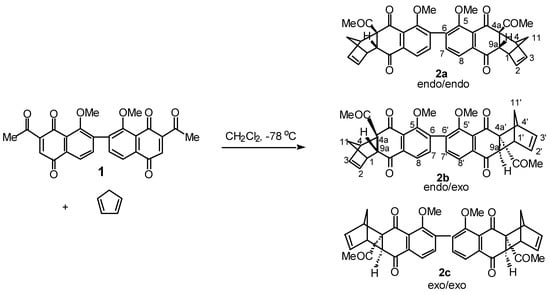 To a solution of 7-(2’-acetyl-8’-methoxy-1’,4’-dioxonaphthalen-7’-yl)-2-acetyl-8-methoxy-1,4- naphthoquinone (1, 25 mg, 0.055 mmol) in dichloromethane (2 ml) cooled to 0 °C under nitrogen was added freshly distilled cyclopentadiene (0.018 ml, 0.22 mmol). After stirring for 10 min., the reaction mixture was poured into aqueous sodium hydrogen carbonate solution (5 ml) and extracted with di- chloromethane (4 x 5 ml). The combined organic extracts were dried over magnesium sulfate and the solvent removed under reduced pressure to give a dark oil. Purification by flash chromatography using hexane-ethyl acetate (6:4) as eluent afforded a yellow oil which was further purified by HPLC on a Partisil 10 M9 semipreparative column using hexane-ethyl acetate (75:15) as eluent to afford: (1S,4R,4aR,9aR,1’S,4’R,4’aR,9’aR)-4a-Acetyl-6-[[4a’-acetyl-1’,4’,4a’,9a’-tetrahydro-1’,4’-methano- 5’-methoxy-9’,10’-dioxoanthracen-6-yl]-1,4,4a,9a-tetrahydro-1,4-methano-5-methoxy-9,10-anthra-cenedione 2a (1.6 mg, 5%) as a yellow oil and (1S,4R,4aR,9aR,1’R,4’S,4a’S,9a’S)-4a-Acetyl-6-[[4a’- acetyl-1’,4’,4a’,9a’-tetrahydro-1’,4’-methano-5’-methoxy-9’,10’-dioxoanthracen-6-yl]-1,4,4a,9a-tetra- hydro-1,4-methano-5-methoxy-9,10-anthracenedione 2b (1 mg, 3%) as a yellow oil.