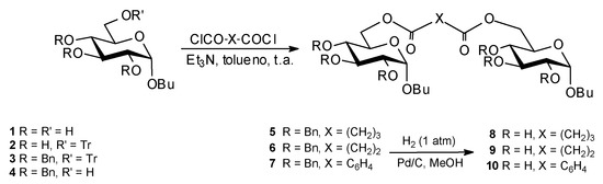 Gemini surfactants were prepared by condensation between suitable protected butyl α-D-glucopyranoside and acyl dichlorides [3,4] (Fig. 1). The products were characterized by spectroscopic/methods (NKr, IR., MS). Molecular formula were confirmed by elemental analysis. Critical micelle concentrations (CMK) of two compounds was determined by the maximum bubble pressure methods [5].
