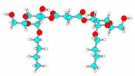 Optimized structure of 1,4-bis-[2-O-(n-butyl-α-D-glucopyranosid] succinate calculated by AM1 method.