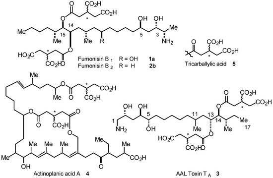 Tricarballylic acid (TCA) 5 is found as a fragment in several mycotoxin natural products such as Fumonisin B1 (1a), Fumonisin B2 (2b), and AAL Toxin TA (3) and a macrocyclic polycarboxylic acid which is an inhibitor of Ras Farnesyl-Protein Transferase (FPTase) [1] like Actinoplanic acid (4), (Figure 1). Fumonisins and AAL toxins are sphingosine analog mycotoxins characterized by tricar-ballylic acid side chains.[2] Most notably, fumonisins are known to be natural cancer promoters, and have been linked to human esophageal cancer in parts of China and southern Africa.[3] The occurrence and biological activity of the tricarballylic acid molecule has been studied extensively.[4]