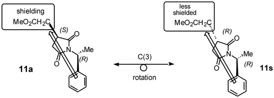 Similarly, the 1H NMR spectrum of compounds 11s/11a shows the (CO2Me) of 11s as a singlet downfield (high chemical shift) at δ (3.66) and the 11a was a singlet upfield (low chemical shift) at δ (3.62), due to the anisotropic shielding effect of the aromatic ring of the phenyl group attached to the succinimide derivatives. We attempted to further separate these diastereomers and confirmed the present of two diastereomers by using gas chromatography at different temperatures (250, 270°C) and also with different retention times, but we obtained a broad peak which included a shoulder of the other diastereomer. HPLC was used for the separation of those diastereomeric mixture of 11s/11a, unfortunately those diastereomeric mixture was enriched to each other.