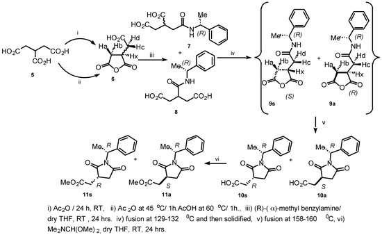 The diastereomeric mixture of (R)-2-(methoxycarbonylmethyl)-N-(R)-1-(1-phenylethyl) succinimide 11s and (S)-2-(methoxycarbonylmethyl)-N-(R)-1-(1-phenylethyl) succinimide 11a was synthesized by reaction of 2-(carboxymethyl)succinic anhydride 6 with (R)-(α)-methylbenzylamine in dry THF/room temperature/24 hrs. The diastereomeric mixture of 1-[(R)-(α)-Methylbenzylamideformyl)]propane-2,3-dicarboxylic acid anhydride 9s and 1-[(R)-(α)-methylbenzylamideformyl)]propane-2,3-dicarboxylic acid anhydride 9a was isolated as an intermediate under the reaction conditions. This diastereomeric mixture 9s/9a was also prepared by a different route via reaction of 1-(chloroformyl)propane-2,3-dicarboxylic acid anydride 12 with (R)-(α)-methylbenzylamine in the presence of DMA at 0°C for 24 hrs.