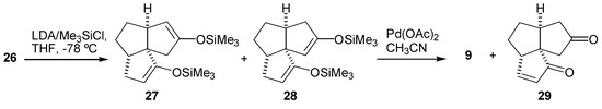 In addition to the enol silyl ether/palladium acetate method, other procedures involving palladium(II) oxidation of the diketone (26) or enedione (29)were examined. [36,37,38]. Either a mixture of products was obtained, none of which was the desired dienedione (9), or the dienedione (9) was obtained in very low yield (<10%).