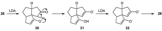 Initial synthetic plan called for a conversion of the diketone (26) into the dienedione (9) following Saegusa procedure [19]. Thus, the diketone (26) was converted to a mixture of the bisenol silyl ethers (27) and (28) upon treatment with LDA-TMSCl according to the procedure of Corey et al [34]. A GLC analysis of the crude product indicated that the two bisenol silyl ethers were formed in a ratio of about 1:1. Oxidation of this 1:1 mixture of (27) and (28) with palladium acetate gave the dienedione (9) and enedione (29) in 20% and 10% yield, respectively (Scheme 5). A variety of more hindered bases were used instead of LDA in an attempt to achieve a regioselective formation of the bisenol silyl ether (27). These included both lithium and potassium bis(trimethylsilyl)amides, lithium tetramethylpiperidide and lithium bis(phenyldimethylsilyl)amide. The reactions were carried out in THF at -78°C, in an attempt to prepare the kinetically favored bisenol silyl ether. Alternatively, preparation of the bisenol silyl ether (27) under thermodynamic conditions, by treatment of the diketone (26) with TMSBr-Et3N in DMF [35], or TMSI-Et3N in CH2Cl2 was attempted [18]. In all cases, the results were similar in that the ratio of regioisomers (27) and (28) was close to 1:1, as determined by GLC analysis. The subsequent oxidations with palladium acetate produced consistently the dienedione (9) and the enedione (29) in ≈ 2:1 ratio and in a low yield. Formation of a relatively large amount of the bisenol silyl ether (28) may be rationalized by proposing that the base first abstracts the least hindered C-3 proton to give the lithium enolate (30) (Scheme 6). This enolate may then, in an intramolecular reaction, abstract the C-11 proton and produce the undesired enolate (31). Deprotonation of (31) with a second equivalent of base, followed by treatment with trimethylsilyl chloride, would produce (28). If this rationale is correct then the use of a more hindered base is of no benefit as it would only increase the difference in reactivity between the C-9 and C-3 protons, and favor the pathway described in Scheme 6. Therefore, it was decided to execute the oxidation steps sequentially.