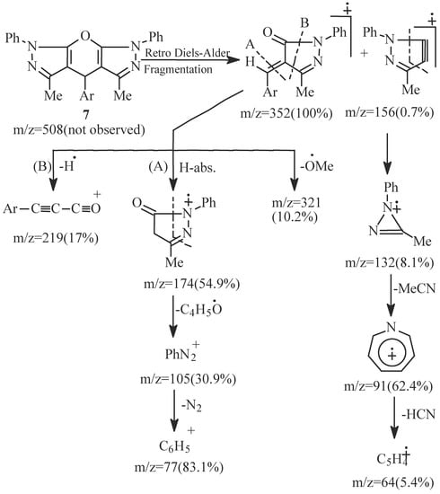Because of the striking biological activity of fused pyrazoles and to extend the present work, equi-molar amounts of 1a and 5 were refluxed in absolute ethanol in the presence of piperidine as a basic catalyst. After 15 minutes an insoluble fraction was isolated as colourless crystals (13%) and identified as the oxinobispyrazole 7. The reaction was then continued for 3h. Removal of most of the solvent and acidification with dilute acetic acid afforded the 1:1 adducts 8a and 8b as pale yellow crystals in 44% and 46% yield respectively [cf. Scheme 1]. The structure of 7 was elucidated exclusively from its IR and mass spectral data beside the correct analytical data and chemical evidence. Thus, the IR spectrum of 7 lacks νC=O and νCN. The mass spectrum of 7, which is represented in Figure 2, is in accordance with the proposed structure. Furthermore, the bispyrazole derivative 7 was identical (TLC, IR, m.p. and mixed m.p) with an authentic sample synthesized by stirring 3,4,5-trimethoxybenzaldehyde with 5 in absolute ethanol in the presence of a catalytic amount of piperidine for 15 minutes [cf. Scheme 1].