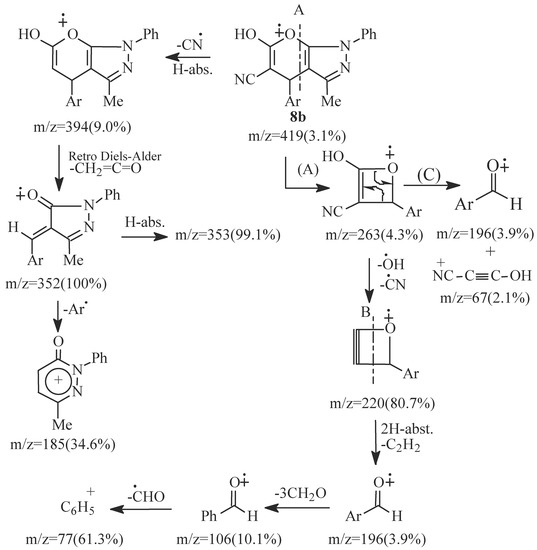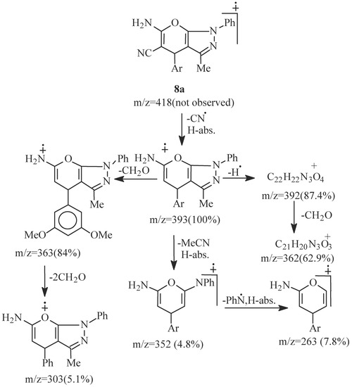 - EI fragmentation of 8a involves primary loss of CN• followed by H-abstraction to give the radi-cal cation of m/z=393/100%; base peak). There is also a loss of formaldehyde molecule to give the ion of m/z=363 (84.0%) which is the major daughter ion. Successive losses of two molecules of formalde-hyde resulted in the radical cation of m/z = 303 (5.1%). The tentative fragmentation pattern of 8a is represented in Figure 3.