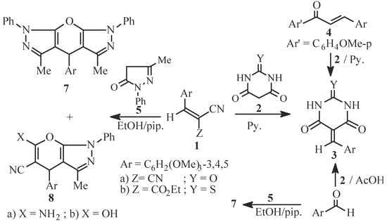 Furthermore, the arylidene derivatives 3a,b are identical (lR, TLC, m.p and mixed m.p) with an authentic sample prepared by stirring 3,4,5-trimethoxybenzaldehyde with barbituric and/or thiobarbitu-ric acids in refluxing acetic acid. A possible pathway for the formation of the arylidene derivatives may be as represented in Scheme 2.