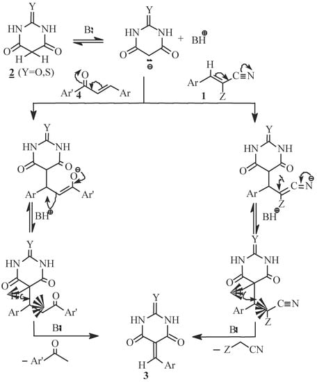 Reaction of chalcone 4 with barbituric or thiobarbituric acid, Formation of 3a or 3b