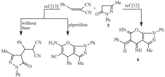 The diverse biological activities of fused pyrazoles have stimulated considerable research in this field [6,7,8,9,10,11]. It has been reported [12] that the pyrazolone derivative 5 reacted with α-cyano-cinnamonitrile in the presence of piperidine to yield the 1:1 adduct 6. On the other hand, it has been also claimed [13] that the above mentioned reaction afforded two products instead of compound 6 [cf. Scheme 3].