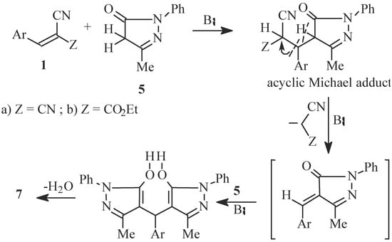 The formation of the oxino bispyrazole derivative 7 from the reaction of 1a and/or 1b with 3-methyl-1-phenylpyrazolone 5 probably proceeds via the initial Michael addition to afford an acyclic Michael adduct which then loses the active methylene moiety, i.e., malononitrile or ethyl cyanoacetate to give the arylidene pyrazolone which could be attacked by a new molecule of 5 followed by a cy-clodehydration step to yield the isolated bispyrazole derivative 7 [cf. Scheme 4]. Cyclization of the acyclic Michael adducts via attack of the ring carbonyl either on the cyano or ester functional group yielded the products 8a and 8b respectively.