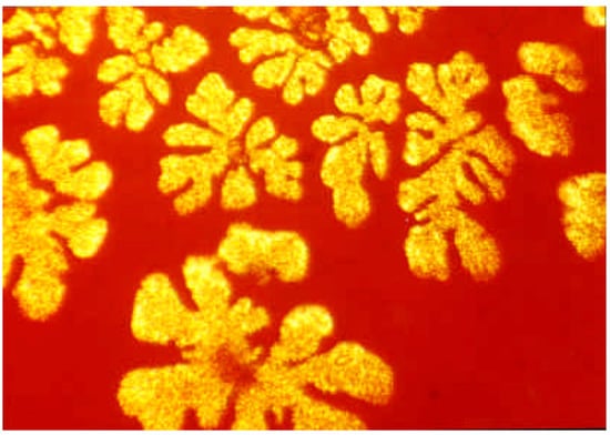 Finger-like texture of compound IIIb-12Co near to phase transition - a mesophase - iso- tropic liquid, 219°C, crossed polarization, magnification x2000.