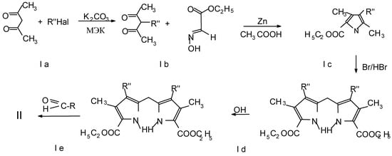 Step Ia was carried out using a modification of the method described in [17], the solvent DMF was replaced by methylethylketone. The method described in [19] was applied for synthesis of pyrrole de- rivatives (Step Ib), but the reaction time was increased. Synthesis of 3,3 -4,4 -dialkyl-5,5 -dicarbethoxydipyrrolylmethane (Step Ic) was carried out using a known condensation method [18]. The techniques of isolation and purification of the final product differed from that given in [18]: the isolated ester was hydrolyzed by a 12% solution of NaOH in ethanol. Isolation was accomplished by adjusting the pH of the solution. Detailed synthetic techniques for the various stages of the reactions (Scheme 1 and Scheme 2) are listed at the end of the paper. The results of CM prognosis and mesomorphism of materials of a series I are considered in [9]. The information on the CM prognosis of this series is only for materials with four hydrophobic substitutes (Table 1 and Table 2). In another paper [7] mesomor- phism for only eight homologs of series I has been studied and supermolecular structures were not identified. All other materials are hypothetical (Table 1 and Table 2).