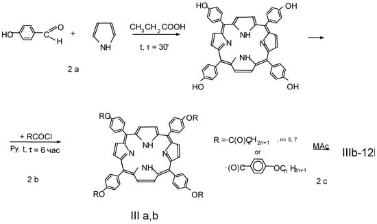 Tetra(p'-dodecyloxy-p-benzoyloxyphenyl)porphyrin - IIIb-12 (Scheme 2, step 2) was obtained by adding to a solution of 5,10,15,20-tetra(p-hydroxyphenyl)porphyrin (0.1g, 0.3 mmol) in pyridine (30 mL a solution of p-dodecyloxybenzoyl chloride ( 0.60 g, 1.8 mmol) in pyridine (50 mL)) over 0.5 hours. The mixture was stirred with heating for 6 h, cooled, diluted with 150 mL of water and then left overnight. The precipitate was filtered off, washed with water and dried, then sometimes also washed with hot ethanol for complete removal of acidic impurities. The remaining product was then purified by chromatography on aluminium oxide (neutral) with chloroform elution; isolated yields: 80%.