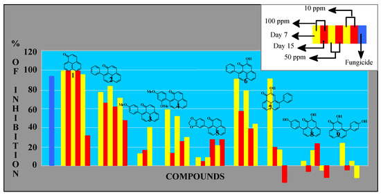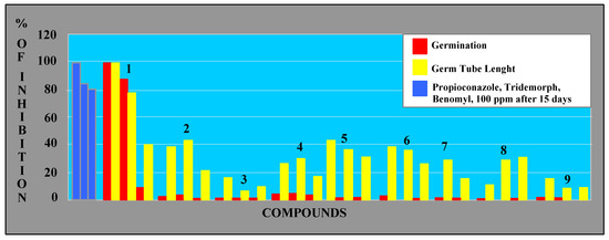 Concerning the effects on spore germination, perinaphthenone (1) at 50-100 ppm, was a more active antibiotic than the commercial fungicides tested (benomyl, propioconazole, tridermorph), as shown in Figure 3. The other compounds, including the phytoalexins, displayed only moderate effects.