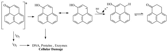 These results indicate the important antifungal properties of synthetic substances 1 and 2. Although perinaphthenone (1) is an efficient singlet oxygen sensitizer [7], very limited information is available about its mode of action. Formation of singlet oxygen and damage to biomolecules (DNA, proteins, fatty acids etc) could be an explanation (Figure 4).