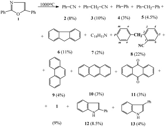 The pyrolyses of diphenyloxazole 1 were performed in a flow-system under argon atmosphere at 0.5 mm Hg, the calculated contact times being ≤ 0.2 s. Under these conditions the oxazole 1 showed a high thermal stability. Whereas at 800°C a conversion of only 9% was achieved, the increase of temperature at 1000°C brought the conversion to 91%. The reaction products were examined by GC/MS analysis and by 1H- and 13C-NMR spectroscopy. The product distribution was a very complex one. The pyrolysis products are shown in Scheme 1 in the order of their elution from the GC column.