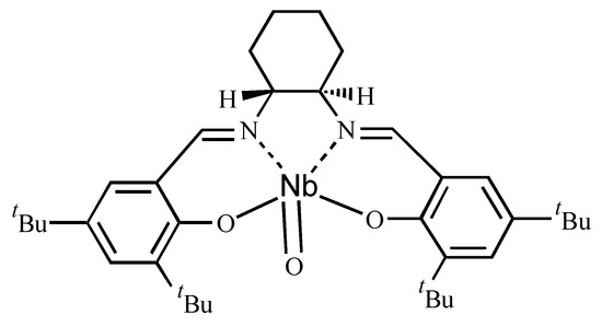 When this complex is used in the Diels-Alder reactions above catalysis is not observed. We currently believe that a Chloro-niobium species is involved in the catalysis and that this is hydrolysed on attempt at isolation. Coordination about Nb is likely as we observed that in this complex a C=N stretch in the IR shifted from 1630 cm−1 (uncomplexed ligand) to 1651 cm−1 (Nb complexed ligand), an effect attributable to the dative bond to the metal. Our current is that the structure of the isolated complex is that shown in Figure 3. However we are currently carrying out further structural studies to unambiguously characterise the isolated complex.
