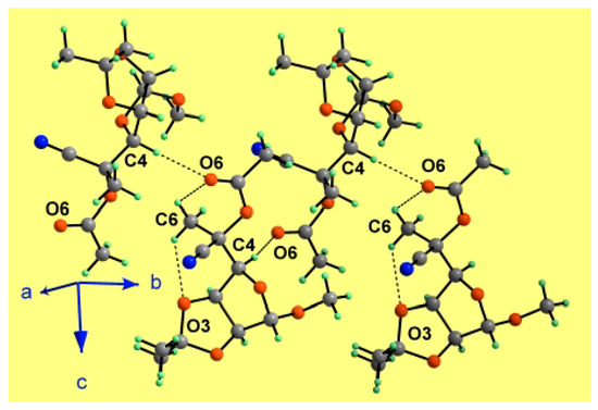 Analysis of the molecular packing in the unit cell revealed two types of hydrogen bonds. In addition to weak intramolecular hydrogen bonds between C6 and O3 and C6 and O6, there are also stronger intermolecular hydrogen bonds involving C4 in one molecule and O6 of the carbonyl group in another molecule, related by a screw axis (Figure 2). The graph-set descriptor of this contact (chain) is C1,1(6). Assignment of the H-bond descriptors are based on the graph-set theory [9]. For convenience, the notation Xa,d(n) has also been adopted, in which (X) is the pattern descriptor, (a) is number of acceptors, (d) is number of donors and (n) is the number of atoms comprising the pattern.