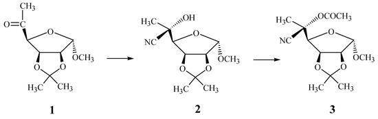 Application of the Kiliani cyanohydrin synthesis to methyl 6-deoxy-2,3-O-isopropylidene-α-d-lyxo-hexofuranosid-5-ulose (1) [6] (prepared from methyl 2,3-O-isopropylidene-α-d-lyxo-pentodialdo-1,4-furanoside [7,8] by the Grignard reaction with methylmagnesium iodide and subsequent oxidation of the reaction product with pyridinium dichromate) led to the formation of methyl 5-cyano-6-deoxy-2,3-O-isopropylidene-β-l-gulofuranoside (2) (Scheme 1). The almost 92% isolated yield of 2 indicates a high stereoselectivity for the cyanohydrin formation. Acetylation of 2 under usual conditions afforded methyl 5-O-acetyl-5-cyano-6-deoxy-2,3-O-isopropylidene-β-l-gulofuranoside (3).